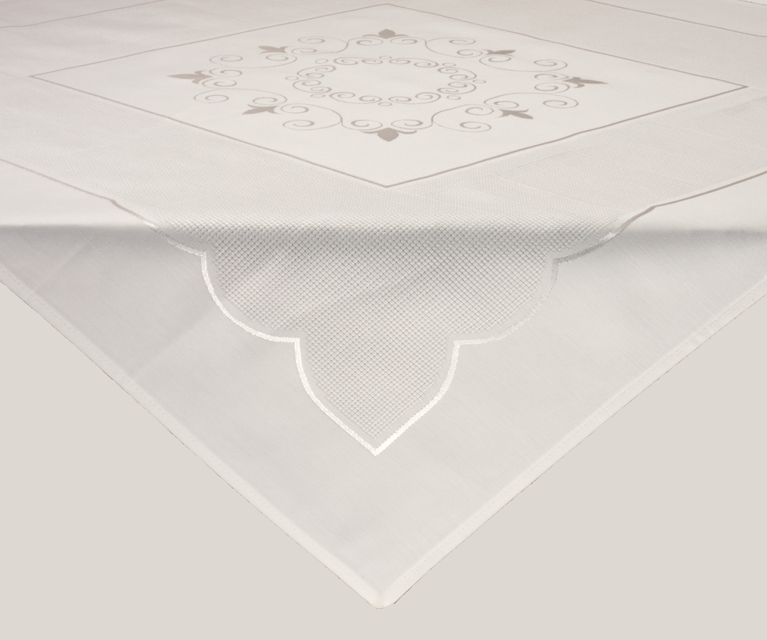 Damast-Mitteldecke mit umlaufender Aidabordüre und Lilienranken